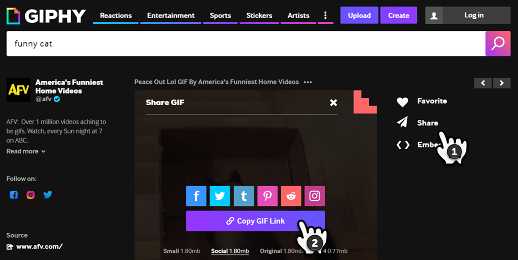 Visit Giphy.com and use your preferred keyword for searching. I'll stick with 'funny cat,' but this time, I'll be an animated one.